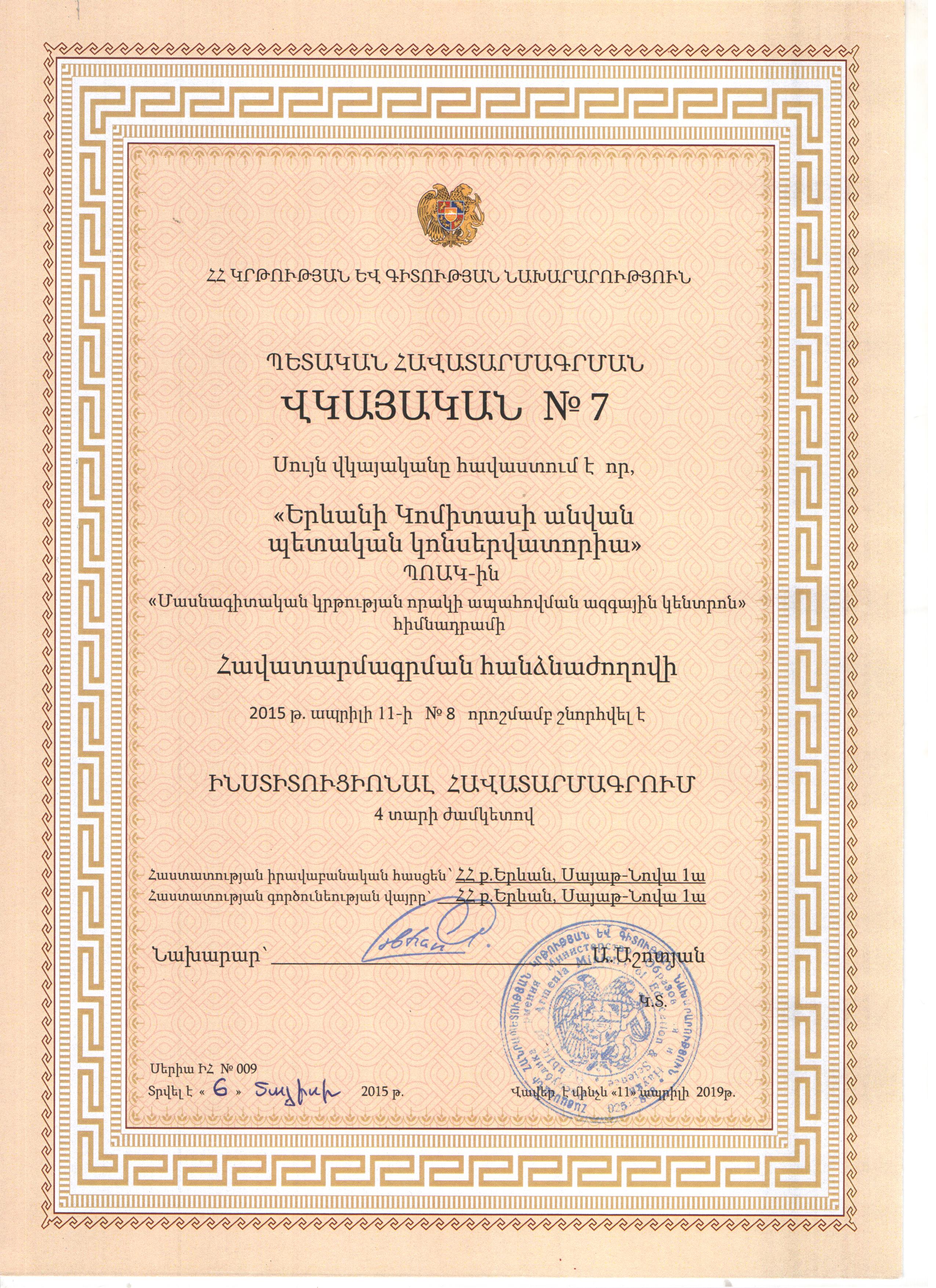 | Full name of educational institution (branch) , organizational form | Yerevan Komitas State Conservatory SNCO |